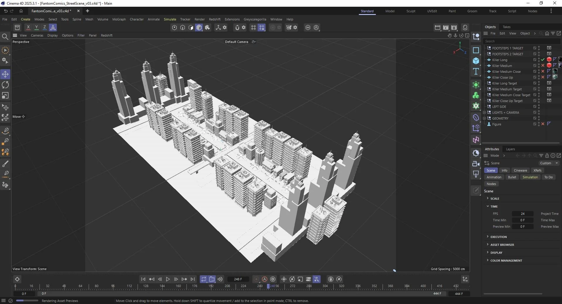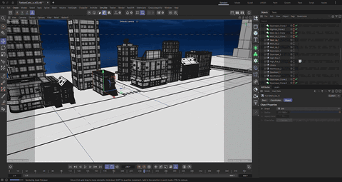 From there I started building a separate Cinema 4D project as an asset folder with all my models. Everything from walk up houses, storefronts, apartment buildings, and skyscrapers to the street level details like mailboxes, street lights, and benches were collected in this project and textured with simple Redshift toon shaders. All the models were sourced from The Happy Toolbox via Greyscale Gorilla and the C4D content browser.