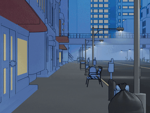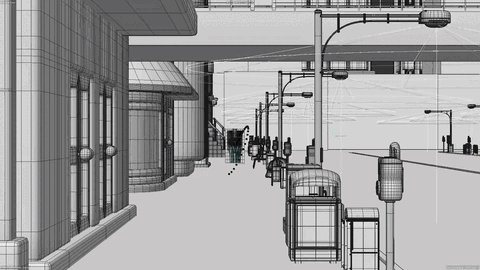 I had a pretty strong idea of what I wanted the piece to be in my head right from the start. I knew I wanted an urban 3d environment with lots of atmosphere that I could render in a comic book style with thick lines and toon shading. Then, I could handle all the characters in the scene as 2d cutouts really leaning into the comic book inspiration for the piece. I started by blocking out the rough lay of the street with splines. Once I was happy with the rough outline of my city block, I created the geometry for the curb, sidewalk, and asphalt street.