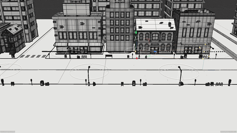 With my city block arranged it was time to animate my camera for the first person perspective I wanted the scene to have. My initial conception for the piece was to put the viewer right in the shoes of the protagonist to enhance the creepy mood of the piece overall. To achieve this the camera needed to move down the block at a natural pace with some random bobbing motion to mimic the perspective of walking.