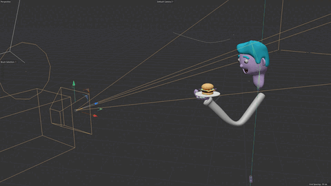 Using some box modeling techniques I modeled the head and neck of the character before applying a bone structure to neck in order to give the head some natural deformation and range of movement. Then I modeled hand/arm and the plate with the burger. I made sure to parent the plate with the burger to the hand so when the hand moves at the beginning of the animation, everything moves in sync. Then I used used point level animation to deform the mouth from a happy smile into the distressed bemusement. For the eyebrows, I modeled them with a spline, then animated the spline to change the expression of the character.