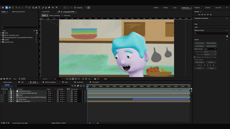 I didn’t want to over-complicate the 3D aspect of the animation, so I opted to only model what would be in frame for the render. As you can see in the behind-the-scenes images, that meant I just modeled the head, arm, and hamburger for animation. With those aspects rendered on alpha, I brought the EXRs into After Effects for compositing.